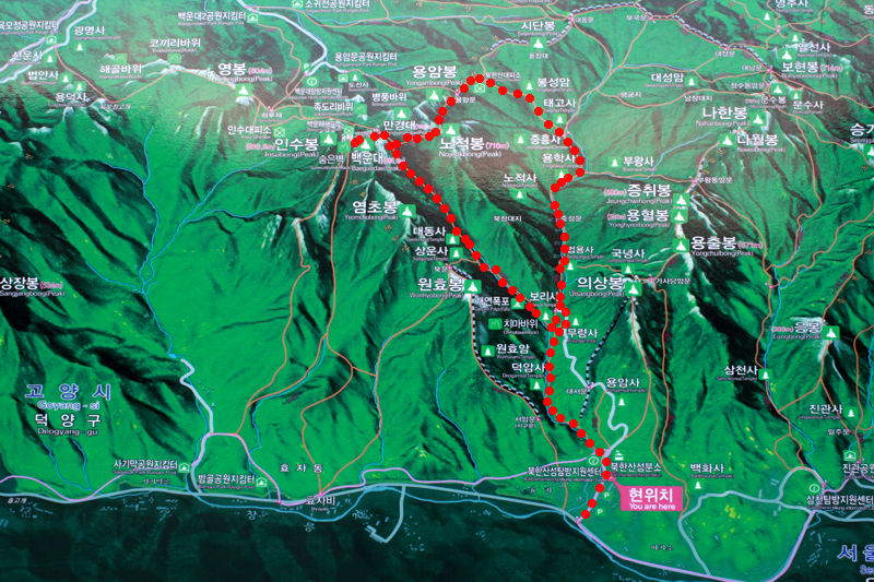 Von Seoul aus erreicht man den Park von verschiedenen Seiten mit den öffentlichen Verkehrsmitteln. Ich wählte kurz nach 6 Uhr morgens die Metro Linie 3 von Jongno 3-ga nach Gupabal (ca. 20 Minuten) und weiter den Bus 704 bis zur Haltestelle Bukhansanseong (10 Minuten, Eingang vom Nationalpark). Die Metro ist modern und an allen Stellen in Koreanisch, Japanisch, Chinesisch und Englisch ausgewiesen. Die Tickets können am englischsprachigen Automaten gekauft werden. Nach der Fahrt wird das Pfand von 500 KRW an den Refund Automaten zurückerstattet. Busfahren ist da schon etwas schwieriger. Die Bushaltstellenpläne sind komplett auf Koreanisch, nur Haltestellen mit Metroanschluss sind zusätzlich auch auf Englisch ausgewiesen. Bustickets können im Bus gekauft werden, die Busfahrer sprechen aber meist kein Englisch. In den Bussen gibt es jedoch Anzeigetafeln, die auch alle Haltstellen auf Englisch ausgeben. Ich fand meine Haltstelle in dem ich einfach dort ausgestiegen bin, wo ein älterer Koreaner mit Outdoorkleidung und Wanderstöcken ausgestiegen ist.